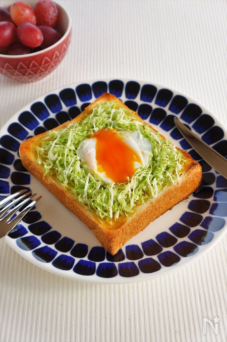 カレー粉とマヨネーズを混ぜて食パンにぬり、千切りキャベツと卵をのせてトースターで焼きます。仕上げにマヨネーズをかければ出来上がり!