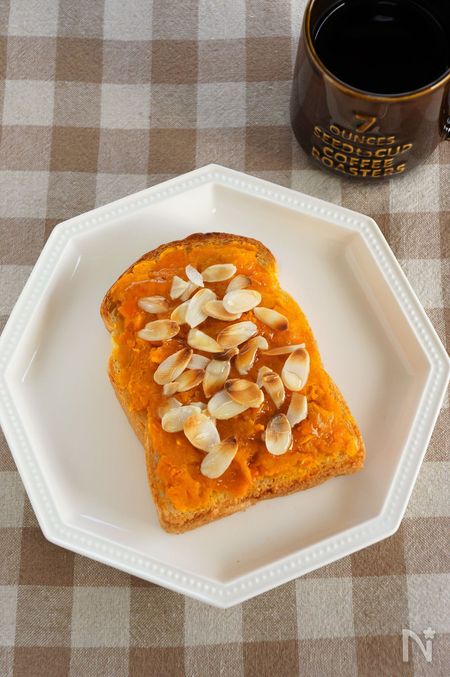 レンジで加熱してマッシュしたかぼちゃに、シナモンパウダー、砂糖、バター、牛乳を加えて混ぜたものを食パンにぬります。その上にスライスアーモンドを散らして焼き、最後にはちみつをかけていただきます。