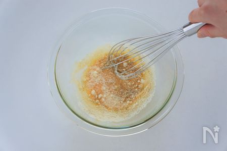 2.ボウルに卵を溶きほぐして、粉チーズ、塩、こしょう、牛乳を順に加え泡だて器で混ぜ合わせる。