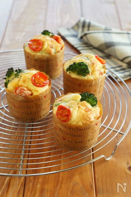 こちらはごろごろ具材の見た目も鮮やかなマフィン。お好みの野菜でアレンジ可能です。野菜を茹でて使用する場合は、よく水気を切ってから加えてくださいね。