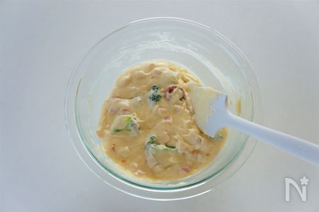 4.1の野菜などをトッピングする分を残して加え、ゴムベラでさっくりと混ぜ合わせる。