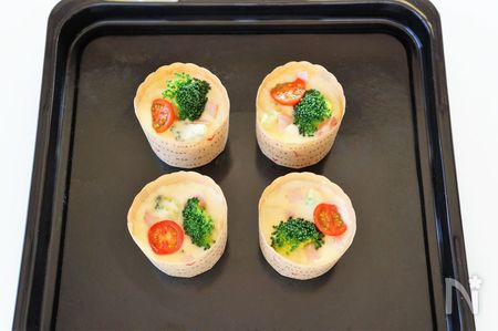 5.4をマフィンカップの7分目まで分け入れて、残しておいた1の野菜などをのせる。