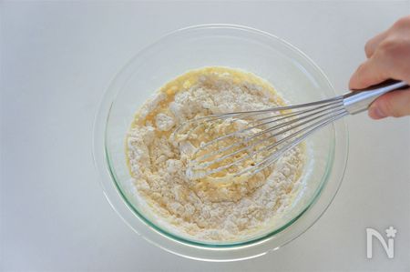 3.ホットケーキミックスを加えて混ぜ合わせ、粉っぽさがなくなったらオリーブ油を加えて混ぜる。