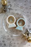 アイシングを作る。 A 乾燥卵白 3g、粉砂糖 100g、水 15g の材料を混ぜ合わせる。透明感がなくなり、ツヤが出てふんわりするまで混ぜる。 出来上がれば、2つの容器にわける。 1つは白のアイシング用、もう1つはブルーのアイシング用。 それぞれ少し固めのアイシングとゆるめのアイシング、2種類の固さを作る。 |