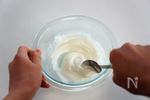 ブルーのアイシングを作る。 食用色素を少しずつ加えて好みの色を作る。 出来上がれば、2と同じように少し固めのアイシングとゆるめのアイシングを作り、それぞれコルネに詰める。 |