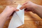 左の角も頂点に合わせるようにくるっと巻き付ける。 先に穴が開かないように調整する。 |