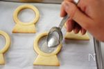 クッキーをクッキングシートの上に並べる。 パラチニットを耐熱容器に入れて、電子レンジ600Wで約2分加熱する。 完全に溶けるまで様子を見ながら加熱する。 完全に溶けたら泡が落ち着くまで少しおいて、クッキーの枠に流しこむ(2~3分で固まる)。 同様に8個作る。すぐに固まるので、40gずつ作業するのもおすすめです。 |