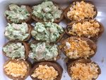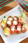 アボカド寿司と玉子の寿司を作る。 すし揚げにすし飯を詰め、揚げのふちを内側に入れて形を整える。 アボカドと海老を和えたものを乗せ、上に半身に切ったブラックタイガーを乗せ、きゅうりをピックに刺したもので飾る。 玉子の方は、ざるで漉したゆで卵を乗せ、マヨネーズなどのソースを乗せる。(このソースはお好みのものでOKです) |