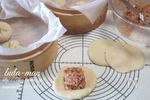 皮に具材を入れて包み込む。 蒸篭に並べる。 |