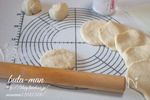 皮の生地を8等分にする。 めん棒等で薄くのばす。 生地が柔らかくてべたつきやすいので、打ち粉(分量外)をして下さい。 |