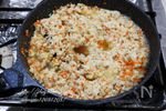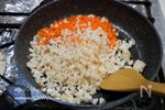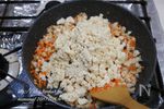鶏挽き肉の色が変わってきたら、蓮根、にんじん、ちくわを入れて炒める。 | |