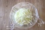玉ねぎはみじん切りにする。 耐熱ボウルに入れてふんわりラップをし、600ワットの2分チンをする。 |