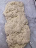 まとめた生地を台に打ち粉〈分量外・強力粉〉を広げた上に長方形に手で伸ばす。 〈10cm✖️20cmくらい〉 |