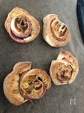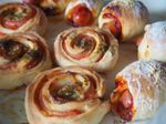 ロール状の生地を4等分して、B 乾燥バジル 適量、追加用マヨネーズ 大さじ1 を表面に塗る。 |