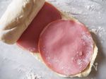 マヨネーズを塗り、パジルを振り、ロースハムをのせて端から巻く。 〈マヨネーズは端まで塗らない〉 |