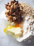 ☆バターは室温で柔らかくしておく。 〈急ぐ場合は電子レンジ200Wに10秒かける〉 ☆クルミ・アーモンド・レーズンは飾り用を半分残して粗く刻んでおく。 |