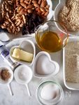 ボウルにA 薄力粉 100g、ベーキングパウダー 2g、オートミール 90g、卵 1個、砂糖 50g、バター 30g、オリーブオイル 40ml 〉を入れて混ぜ合わせる。 |