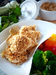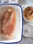 天板に鶏むね肉を並べて上にマヨネーズを塗り、パリパリチーズパン粉をまんべんなく振りかける。 | |