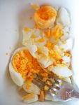 ゆで卵の白身をフォークでつぶしてたまねぎ、A マヨネーズ 大さじ3、プレーンヨーグルト 大さじ1、マスタード 小さじ1、塩 小さじ1/2、こしょう 少々、砂糖 小さじ1/2 を合わせて最後にパセリを加える。 |