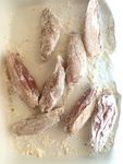 同じフライパンに鶏肉に小麦粉をまぶして皮面から入れてこんがり焼く。 | |