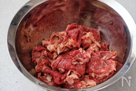 牛肉は長いものは食べやすく切り、下味用の醤油とみりんを揉み込んでおきます。