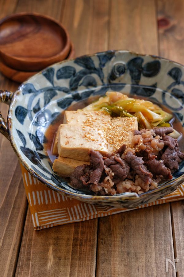 豆腐と牛肉、ねぎをだし汁としょうゆ、みりん、砂糖などで煮込んだ家庭料理の代表「肉豆腐」。おふくろの味ともいえるどこかほっとするおかずのひとつです。地域によって牛肉を使ったり、豚肉を使ったり、それぞれのご家庭で入れる野菜が違ったり、アレンジしやすい料理でもあります。