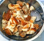 ボールに牛乳と砂糖を入れて混ぜ、パンをちぎって浸します。 | |