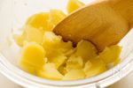 じゃがいもを水で濡らし、耐熱ボウルに入れ電子レンジ600wで3分半~4分程加熱します。じゃがいもに竹ぐしがすっと通ったら電子レンジから取り出し、塩を振って木べらなどで潰しながら手早く混ぜます。 | |