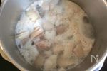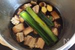 豚ばら肉の下茹でをします。鍋に豚ばら肉とかぶるくらいの水を入れ再び火にかけ、沸騰してから圧力鍋の高圧で15分→急冷します。 | |