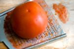 すりおろしトマトの量とそばつゆは1:1にする。トマトはあまり多いと味が薄くなるので注意する。角切りトマトはワタを取り除いています。