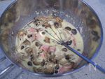 ボウルにA 卵 1個、牛乳 60ml、生クリーム 60ml、粉チーズ 大さじ1、塩こしょう 少々 を入れ、泡だて器でよく混ぜる。ベーコンと炒めたしめじも加え、混ぜ合わせたらココットに入れる。 上に溶けるチーズをのせる。 |