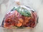 オーブンを200℃に予熱をする。 天板にオーブンシートを敷き、網をのせて水分をきった肉をのせて35分程焼く。 20分経ったところで上下を返し、残り5分でタレを小さじ2かけて焼く。 |