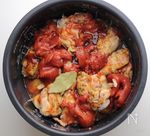焼いた手羽元とB トマト缶詰・ホール(食塩無添加) 1缶、ウスターソース 大さじ1、ローリエ 1枚 も炊飯器に入れ普通炊飯で炊く。 |