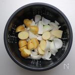 玉ねぎ、新じゃがいもを食べやすい大きさに切って炊飯器に入れる。 (煮崩れしにくいのでメークイーンをオススメします) |