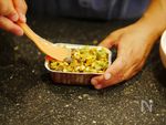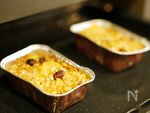 型に2を入れ、押し付けるように平らにならす。 *写真は100円ショップで購入した小さなパウンドケーキ型を使用しました。 *パウンドケーキ型でなくても耐熱性の型でサイズが合えば何でも良いです |
