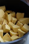 サツマイモは皮を剥き乱切りして水にさらしてアク抜きする。 | |
