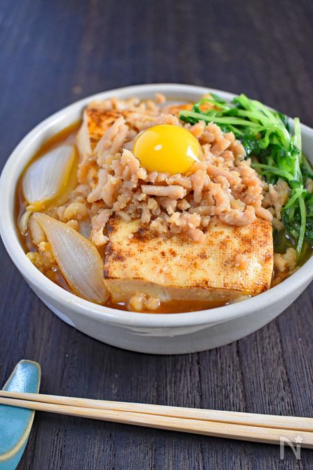 煮崩れしにくい焼き豆腐がおすすめですが、木綿豆腐を焼いて使うアレンジでも問題ありません。タレは濃厚ですが、豆腐の水切りをせずに加えているのでちょうどよく仕上がります。お好みでうずらの卵や卵黄をのせるとまろやかでおいしいですよ。