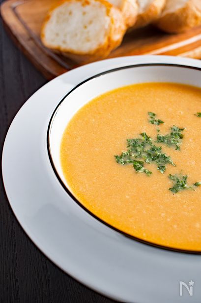 にんじんは丸ごとチンしてミキサーへ!煮込まずに作れる栄養満点のスープです。