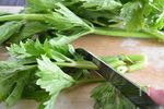 セロリの葉はよく洗って水けをきり、2cm程度の幅に斜めに切る。 にんにくはみじん切り、トマトは一口大の角切りにする。 ※ セロリの葉がある「茎」の部分も一緒に使用してください。 |
