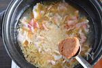 肉に半分程度火が通ったらA 水 500ml、みそ・香(かおり) すりごま 白 各大さじ2、鶏ガラスープの素(顆粒) 大さじ1 を加えて加熱する。 |