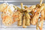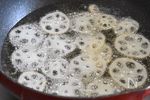 フライパン(または鍋)にサラダ油を2cm程度熱して、れんこんやごぼうが重ならないように広げて入れて揚げる。 | |