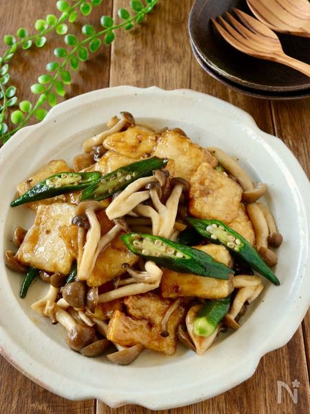 『冷凍豆腐とおくらとしめじの甘辛炒め』