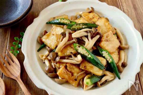 冷凍してから余計な水分を絞った豆腐は、お肉のような食感になるんです。そんな冷凍豆腐をお好きな野菜と一緒に甘辛く炒めれば、ごはんがすすむおかずに。今回は、おくらとしめじを入れて食感をプラスします。低コストでできてヘルシーな、一石二鳥のおかずです。