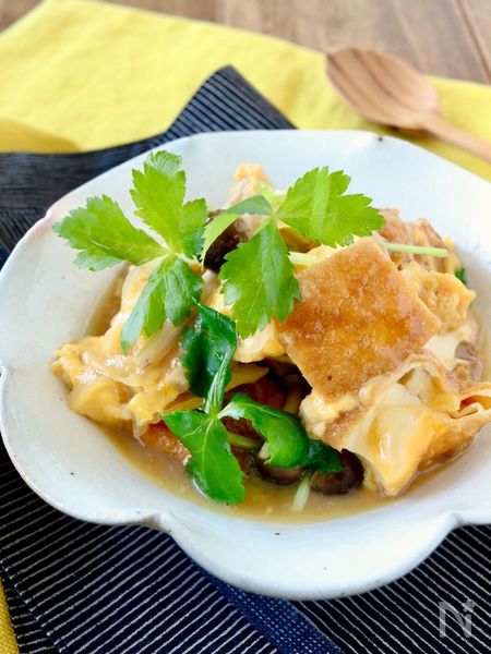 パパッと簡単にできて、丼にもピッタリな厚揚げの卵とじはいかがですか? お安いだけでなく、調理も簡単なので忙しい日の晩ご飯にもおすすめです。だしが染み込んだご飯も絶品ですよ。三つ葉を添えてどうぞ!