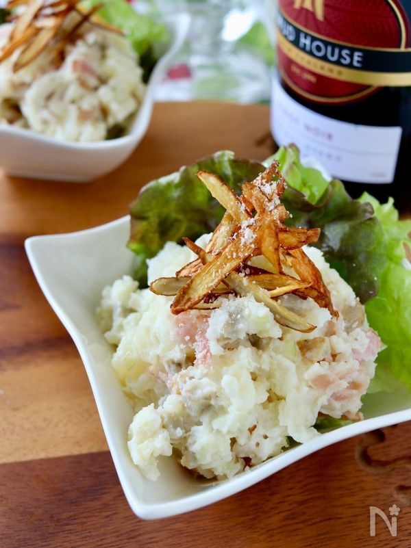 揚げ焼きしたごぼうチップスと、角切りにして炒めた新ごぼうの2つの食感が1度で楽しめるポテトサラダです。ポテトサラダの味付けには、マヨネーズの代わりにクリームチーズを使用し、カロリーダウンにも! 新ごぼうの香りと食感のアクセントがやみつきになりますよ♪