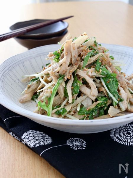 茹でた新ごぼうに市販のサラダチキンと水菜を合わせ、人気のごまだれで和えたボリュームサラダです。アク抜きも茹で時間も短くてすむ新ごぼうこそ、忙しい時に取り入れたい食材。サラダチキンと合わせれば、栄養価もアップし、より腹持ちのよいサラダになりますよ。