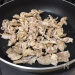 ①の豚肉は炒める直前に片栗粉をまぶす。 フライパンにサラダ油を中弱火で熱し、色が変わるまで豚肉を炒める。 |