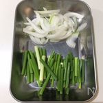 豚肉は大きい物は手で割き、A 醤油・みりん・酒 各小さじ1、にんにく・しょうが(チューブ) 各3cm を揉み込んで15分置く。にんにくの芽は5cm長さにカット、玉ねぎは皮と芯を取り除き、薄切りにする。 |
