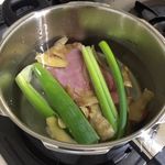 圧力鍋に豚バラ肉(ブロック)とA 生姜(あれば生姜の皮) 15~20g、長葱の青い部分 1本分 を入れ、水約1000~1200ml入れる。※豚バラ肉がぱさつかないよう、かぶるくらいの水を注いでください 圧力鍋の蓋をセットして中火~強火にかけ、高圧までピンが上がったら、ピンの高さを維持するよう火を弱め、20分加圧する。 |