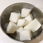 大根は皮を剥き、3cm厚の輪切りにし、半月切りまたは銀杏切り。 卵は半熟卵になる程度まで茹で、殻を剥いておく。 |